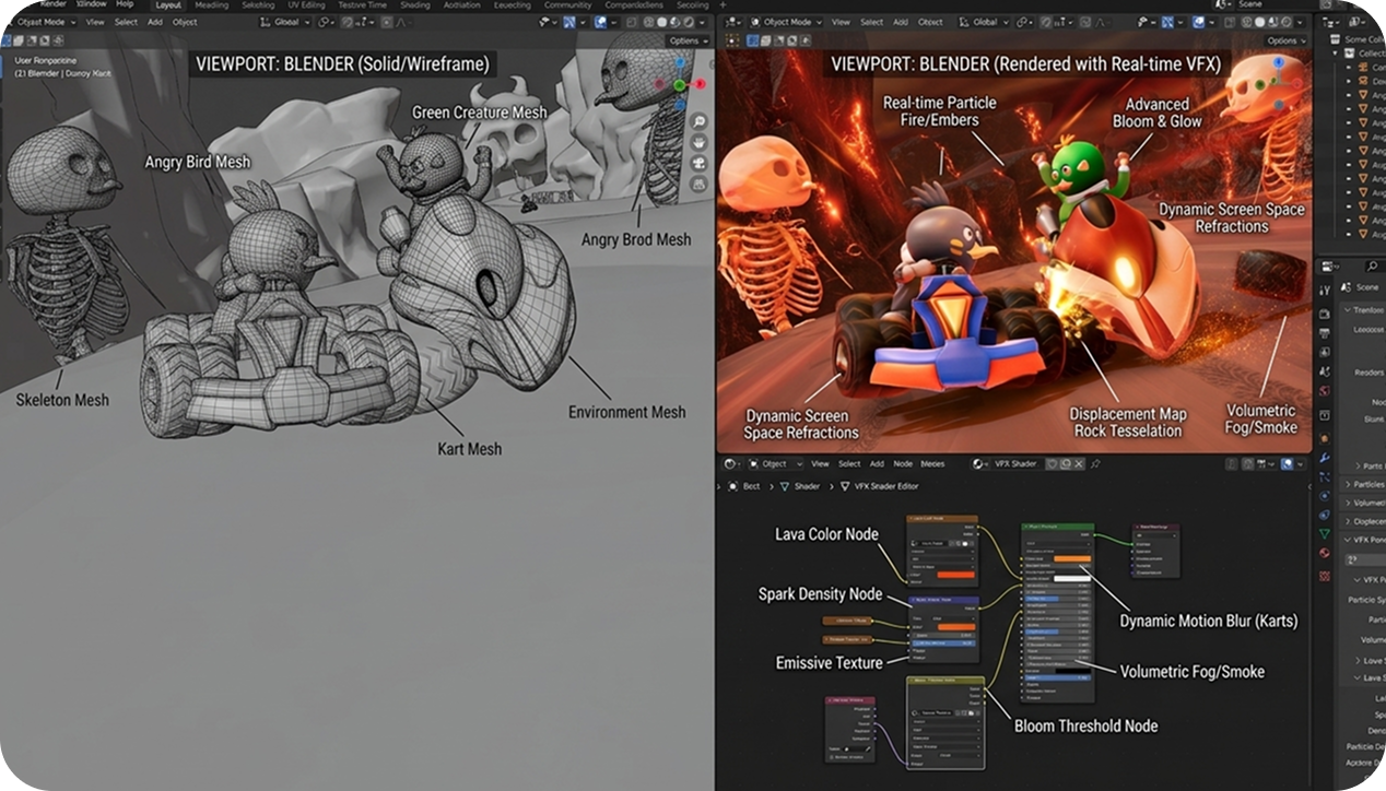 PBR texturing, material setup, and cinematic lighting to transform blockout geometry into vivid game worlds.